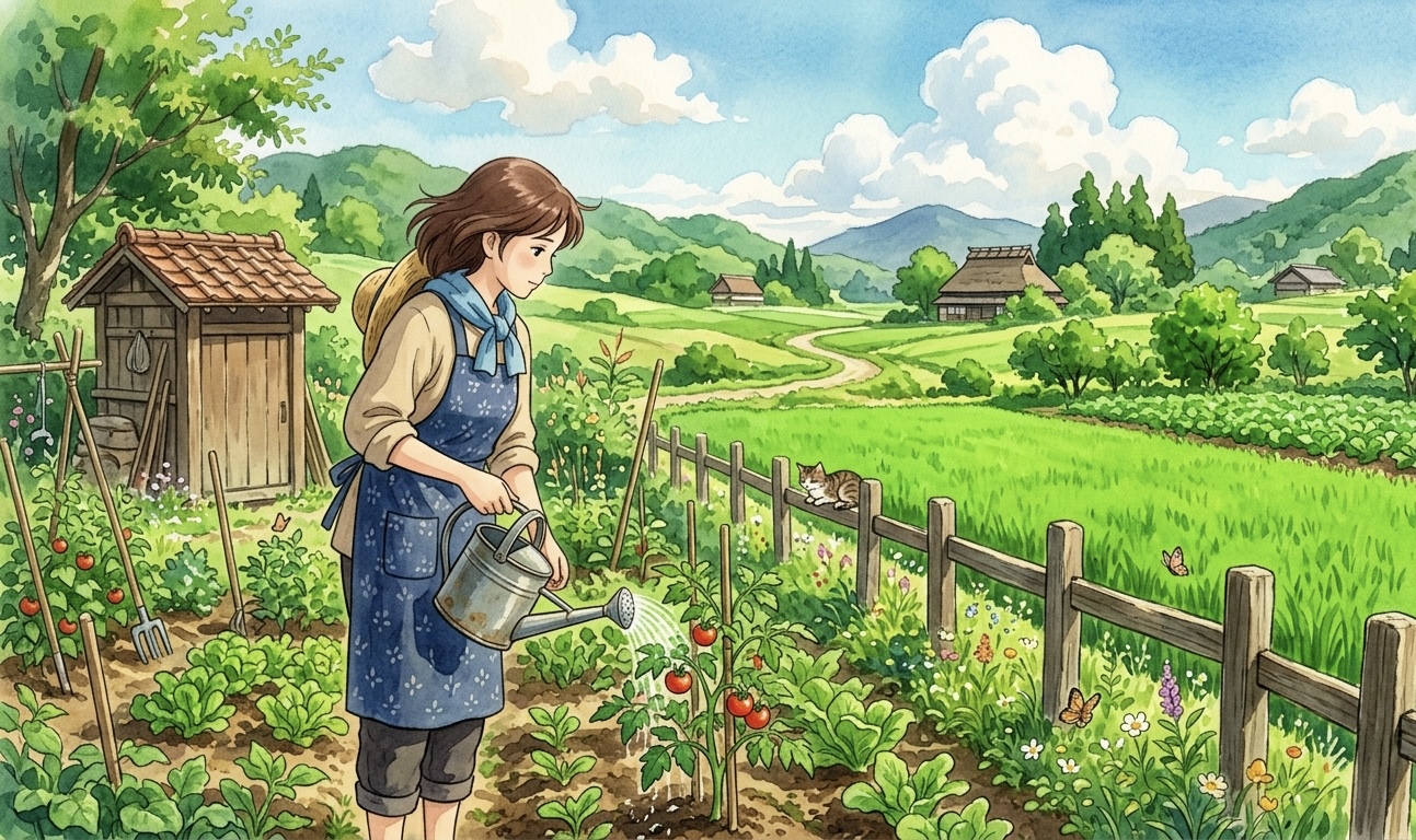 「あの人のトマトは赤いな、立派だな」と横目でチラリと眺めたら、そのまま視線を自分の足元に戻し、手元のジョウロで水をまく。